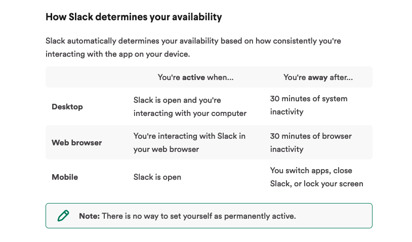 "Note," cautions Slack in bold type, "There is no way to set yourself as permanently active."