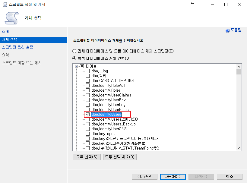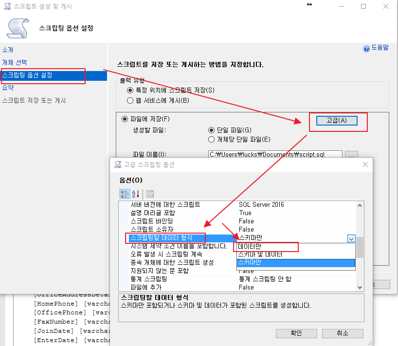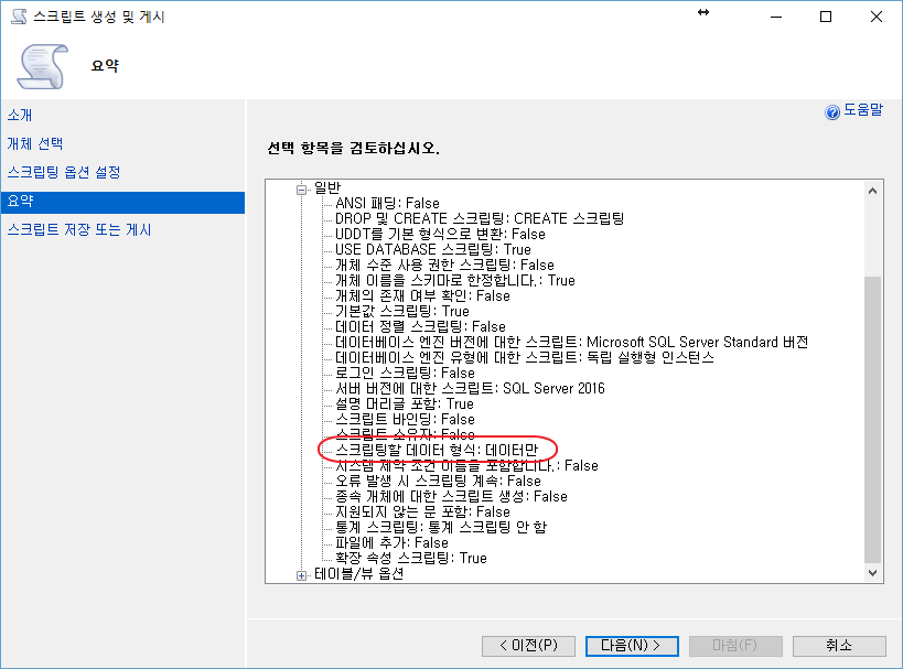 스크립트 옵션 설정 > 고급 에서 "스크립팅할 데이터 형식" 에서 "데이터만" 으로 선택을 하고, 다음을 선택합니다.