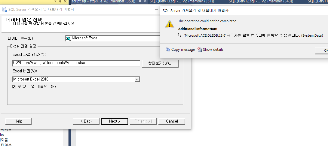 'Microsoft.ACE.OLEDB.16.0' 공급자는 로컬 컴퓨터에 등록할 수 없습니다. (System.Data)