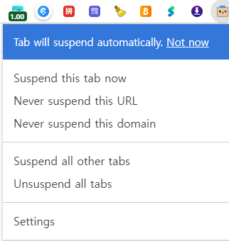 캡처 이미지에 있는 서스펜더는 성능은 좋은데, 웹스토어에서 악성코드로 분류가 잘된다. 잘 막히는 편인데 성능이 맘에들어서 쓰고 있다.