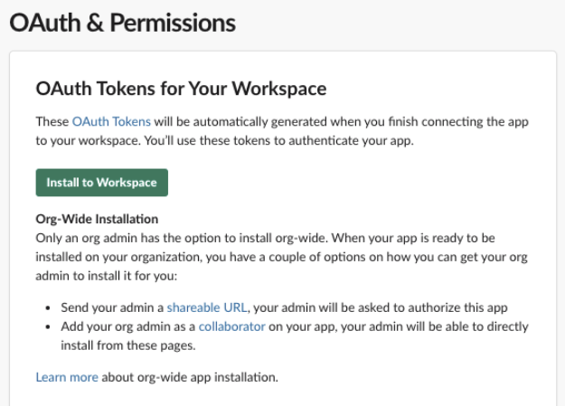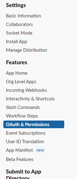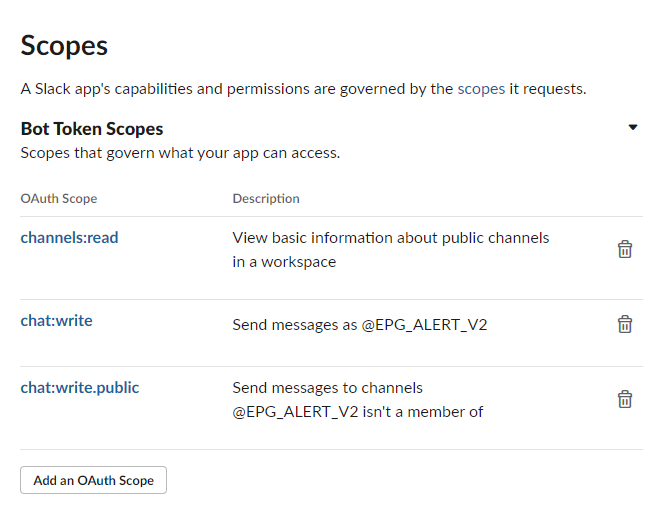 4. OAuth & Permissions -> Scope 에 chat:write , chat:write:public , channels:read 등록