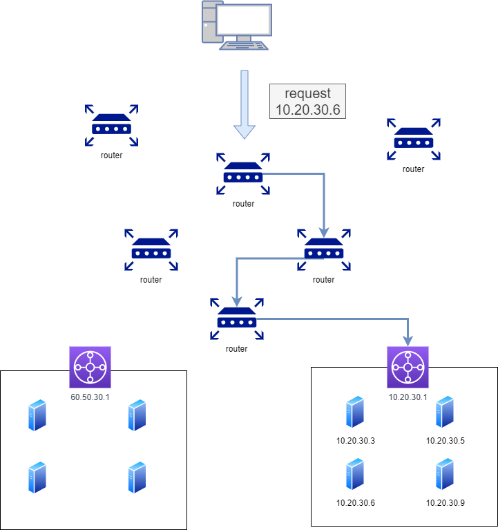 - 요청을 보낼 IP주소를 임시로 10.20.30.6라 가정하면 이 IP주소로 가야 하는 것은 알지만 어떻게 가야 할지 경로는 알 수는데 이때 이 요청이 네트워크를 타고 어떻게 이동할지를 네트워크 장비인 라우터의 라우팅을 통해 이루어진다.