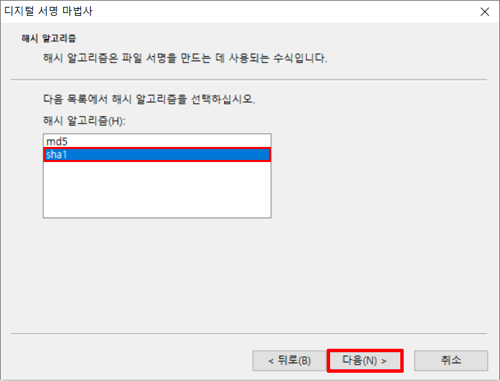 13. sha1 선택하고 다음을 누르세요.