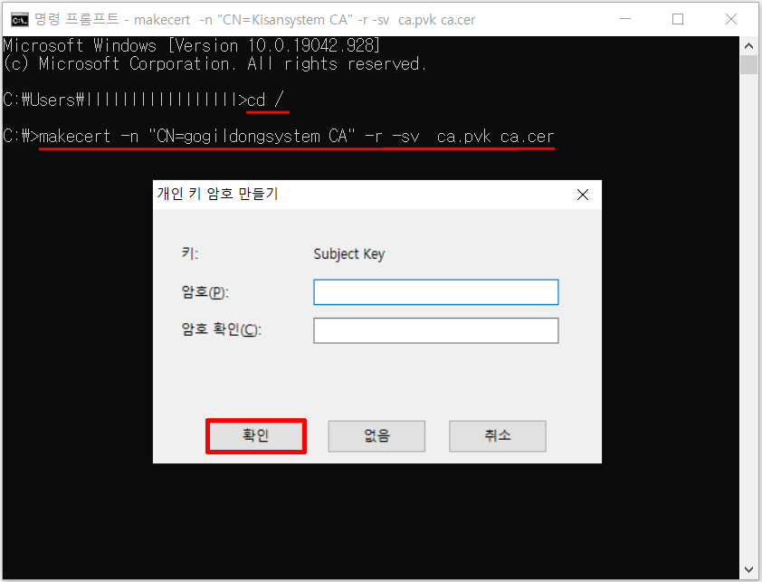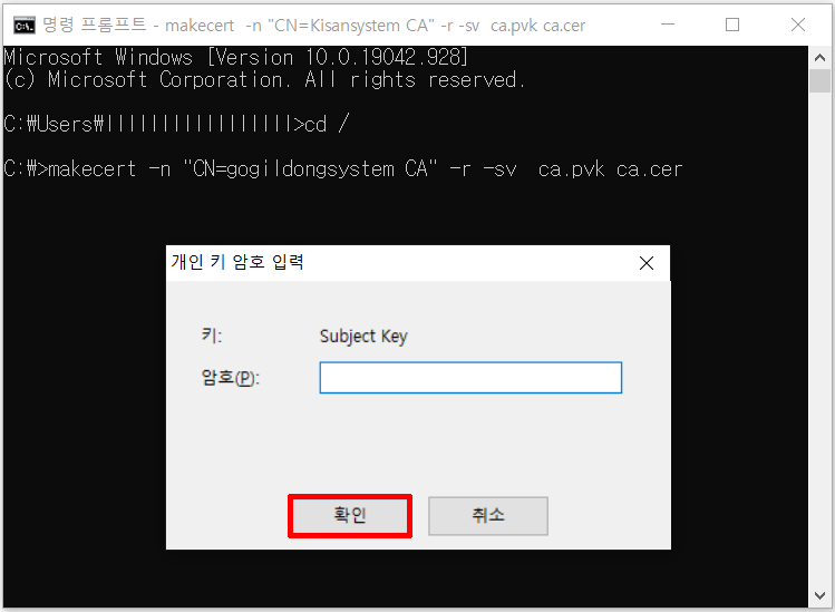 makecert -n "CN=Kisansystem CA" -r -sv ca.pvk ca.cer 라고 입력하고 엔터를 치면 키 암호 입력창이 나옵니다.