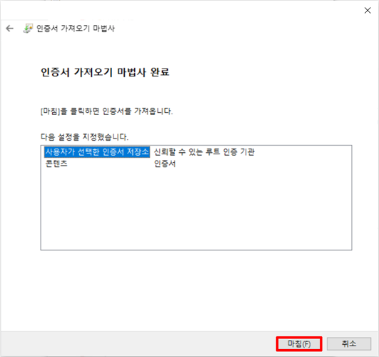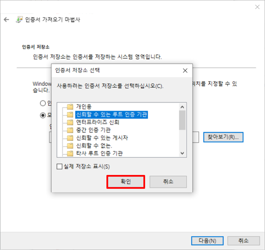 ⑧ 신뢰할 수 있는 루트 인증 기관을 선택하고 확인 누르세요.
