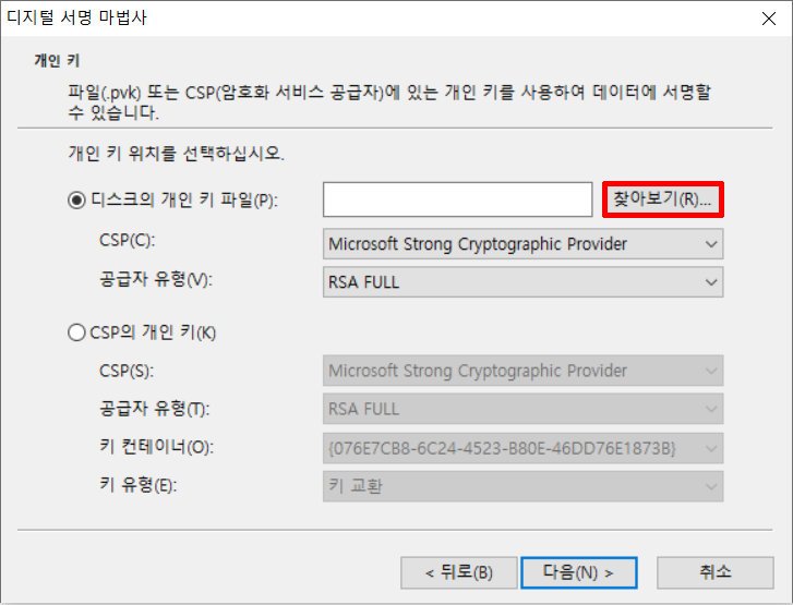 10. 디스크의 개인 키 파일 '찾아보기' 누르세요.