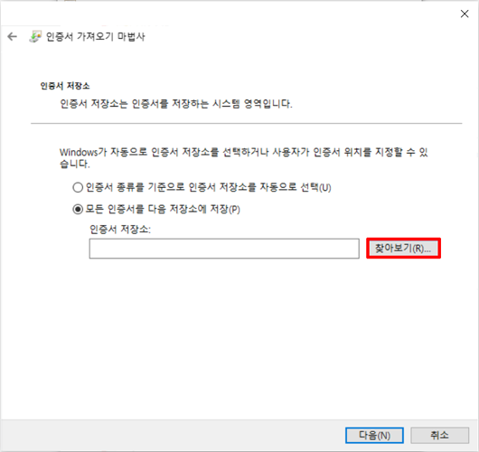 ⑦ 모든 인증서를 다음 저장소에 저장에서 찾아보기를 누르세요.