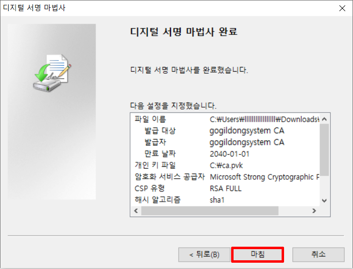 18. 디지털 서명 마법사를 완료했습니다.