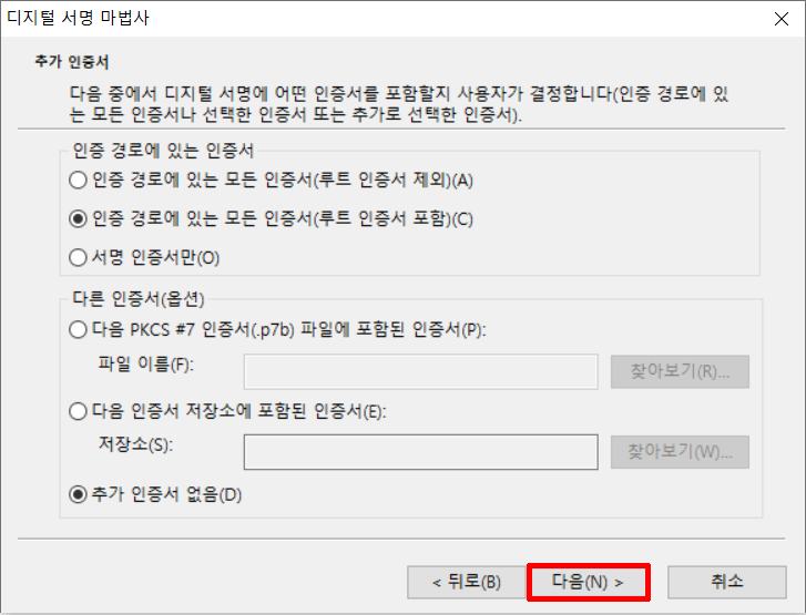 14. 인증 경로에 있는 모든 인증서(루트 인증서 포함) 선택하고 추가 인정서 없음