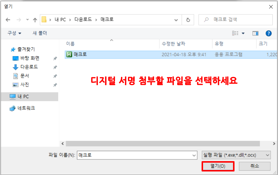 4. 디지털 서명 첨부할 파일을 선택하고 열기를 누르세요.