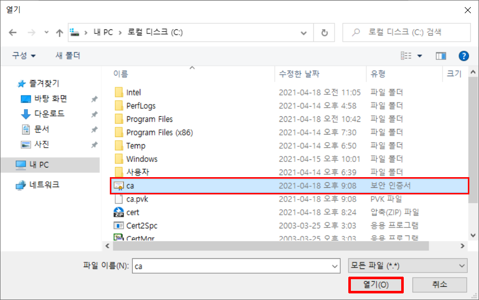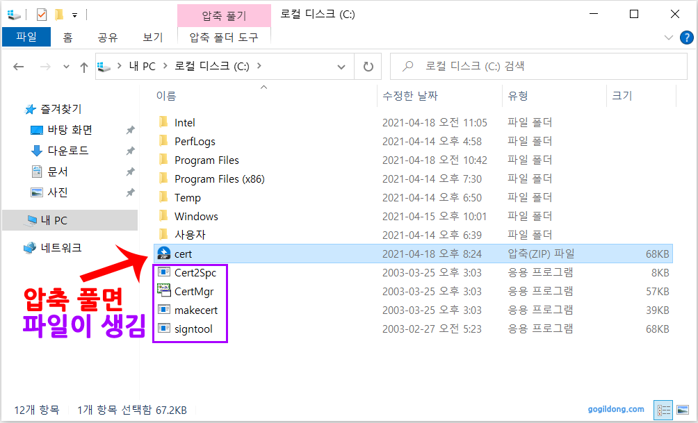 ① cert 다운받아서 C드라이브에 압축을 풀어줍니다.