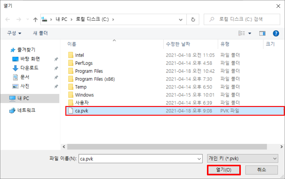 11. 키 파일을 선택하고 열기 누르세요.