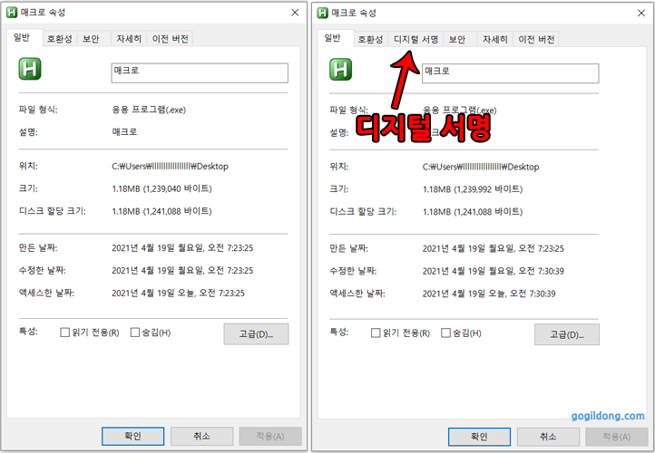 실행 파일을 마우스 오른쪽 클릭하여 속성에서 디지털 서명이 있는지 없는지 확인 할 수 있습니다.