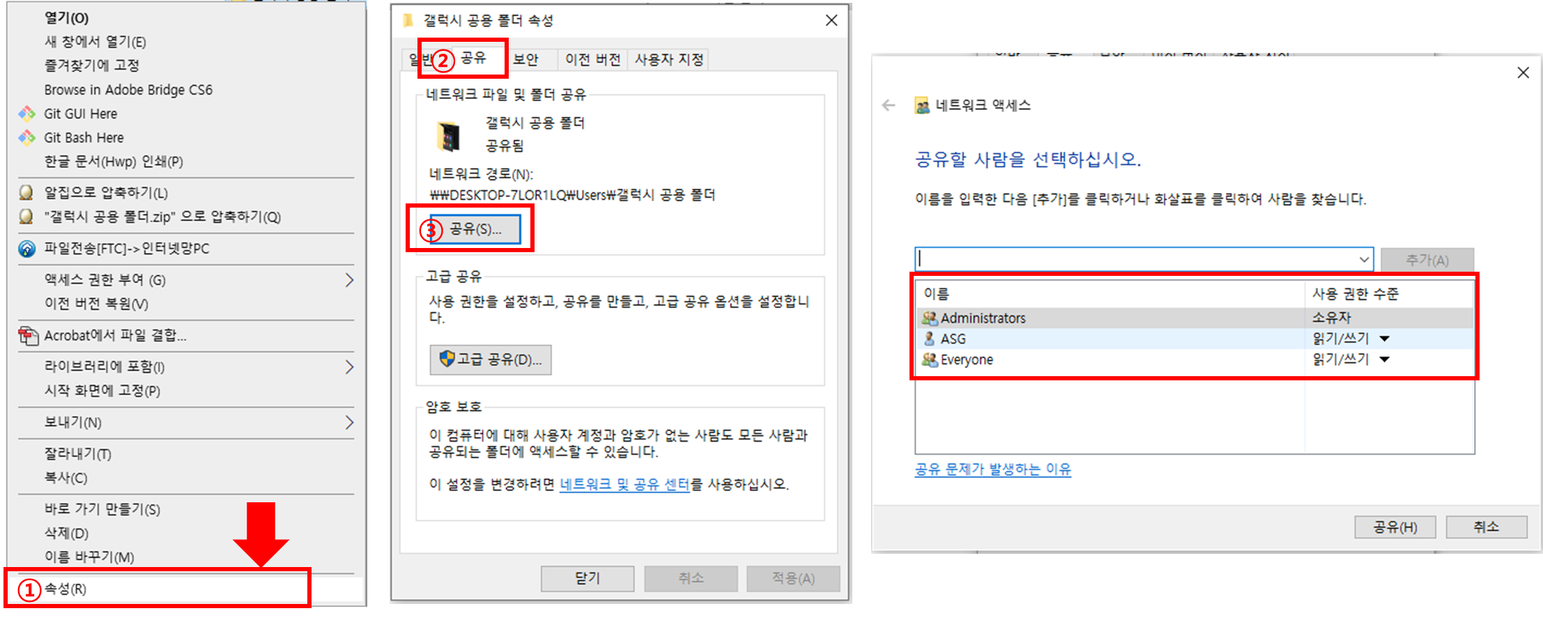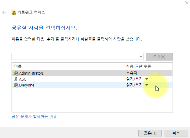[ 속성 창 - 공유 탭 - 공유 ] 를 누르면
