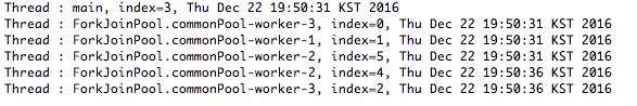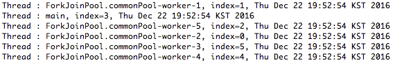 이러한 결과가 나타나는 이유는 내부적으로 Parallel Stream이 common fork join pool을 사용하게 되는데, 1 프로세서 당 1 thread를 사용하도록 되어있기 때문입니다. 예를들어 16 core 장치가 있다고 하면, 16개의 thread를 생성할 수 있습니다. 위 예제의 실행 결과, 4 threads는 실행환경의 맥북이 4 core이기 때문입니다.