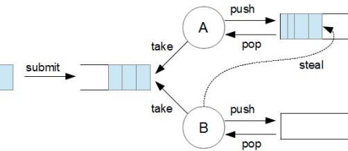 기본적으로는 ExecutorService의 구현체이지만, 다른 점은 각 thread들이 개별 큐를 가지게 되며, 다음 그림의 B처럼 자신에게 아무런 task가 없으면 A의 task를 가져와 처리하게 됨으로써 CPU자원이 놀지 않고 최적의 성능을 낼 수 있게 됩니다.