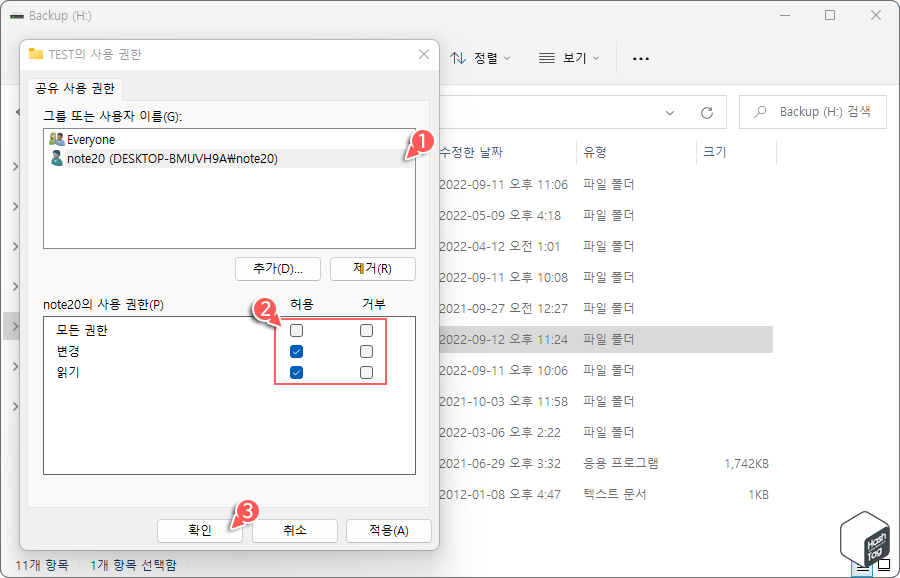 "그룹 또는 사용자 이름(G)" 목록에 추가된 사용자 계정을 선택하고, 하단의 사용 권한을 설정합니다. 앞서 권한 부여 방식과 동일하게 "모든 권한/변경/읽기" 권한을 허용 또는 거부할 수 있습니다.
