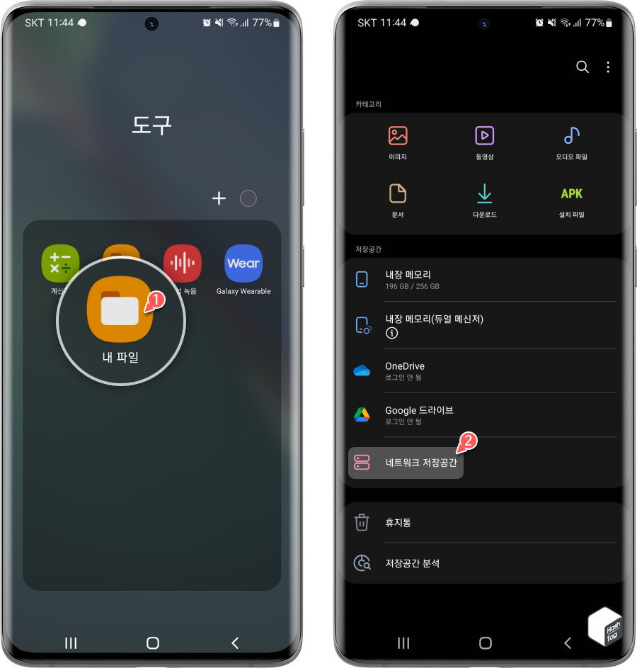 삼성 갤럭시 스마트폰에서 "내 파일" 앱을 실행하고 "저장공간" 섹션에서 "네트워크 저장공간" 옵션을 선택합니다.