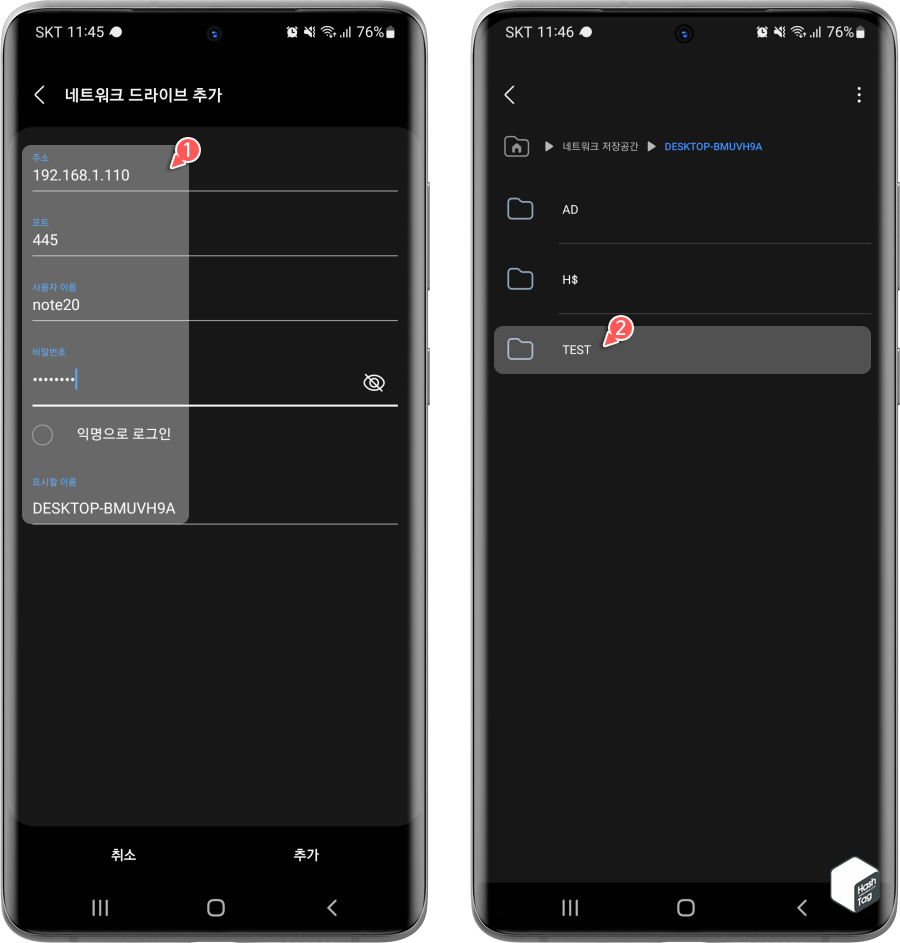현재 네트워크에서 자동으로 탐색된 SMB 네트워크 드라이브는 주소 및 포트는 자동으로 입력되고, "익명으로 로그인" 옵션을 선택 해제한 뒤 사용자 이름 및 비밀번호는 사용자가 직접 입력하셔야 합니다. 참고로 표시할 이름(컴퓨터 이름) 또한 자동으로 입력되며 원한다면 사용자가 식별하기 쉬운 다른 이름으로 변경할 수 있습니다.
