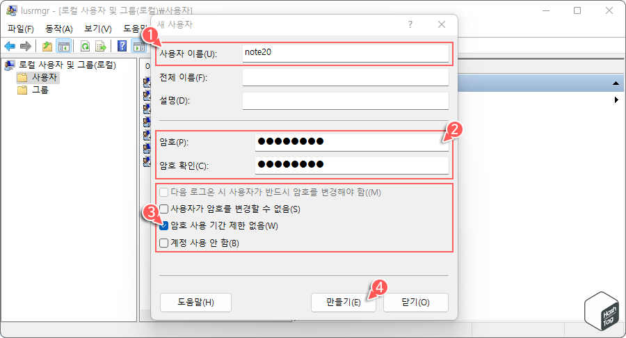 "새 사용자" 창에서 스마트폰과 파일 공유를 위해 사용하려는 "사용자 이름(U)" 및 "암호(P)", "암호 확인(C)"을 입력합니다. 다음으로 "다음 로그온 시 사용자가 반드시 암호를 변경해야 함" 옵션을 선택 취소하고, "암호 사용 기간 제한 없음(W)" 옵션을 선택한 뒤 [만들기(E)] 버튼을 클릭합니다.