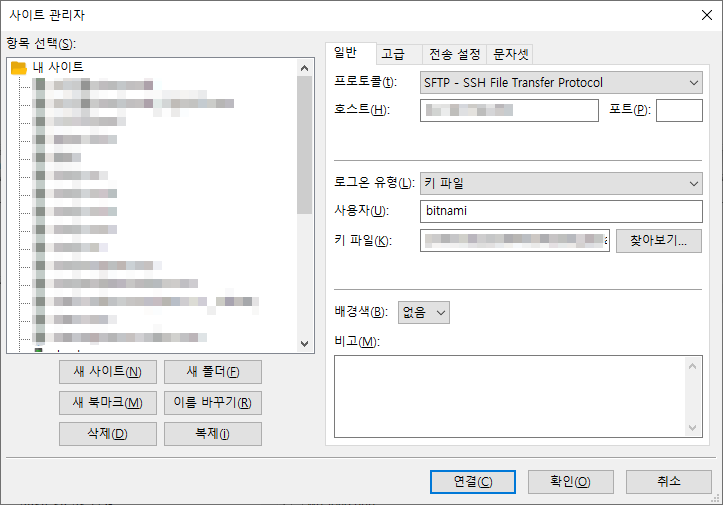 - 파일질라 - 사이트 관리자에서 호스트 입력 후 로그온 유형을 키 파일로 선택해준 후 키파일 위치를 pem 저장경로로 잡으면 연결 끝.