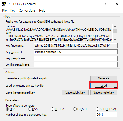 - PuTTY Key Generator (Putty 패키지 다운로드를 받으면 포함되어 있다.) 에서 Load 버튼 클릭