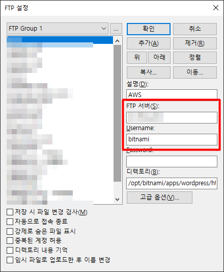- 에디트플러스를 실행시킨 뒤 FTP 설정 에서 FTP 서버 -> 퍼블릭 IP, Username -> bitnami 을 입력 후 고급 옵션 을 클릭한다.