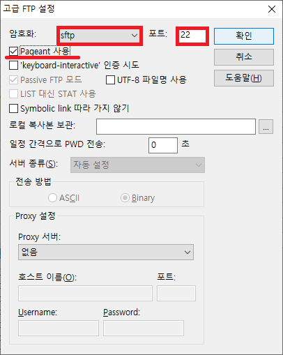 - 암호화 sftp 설정 후 포트번호 22 Pageant 사용을 클릭해준 뒤 확인을 누르면 설정 끝.