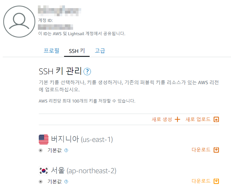 - 아마존 계정에서 pem 파일을 다운로드 받는다. https://lightsail.aws.amazon.com/ls/webapp/account/keys