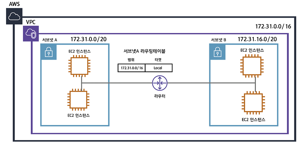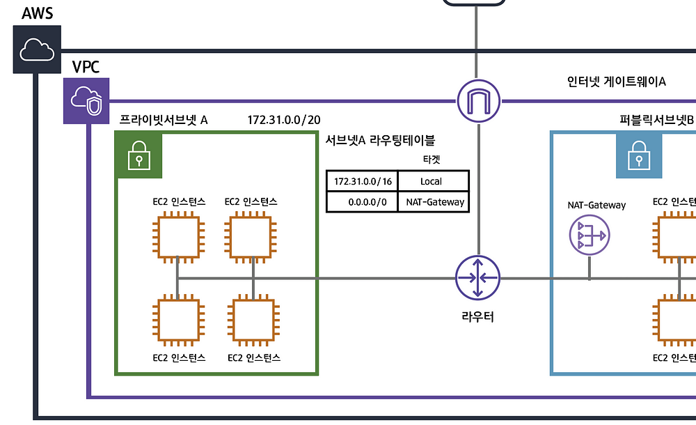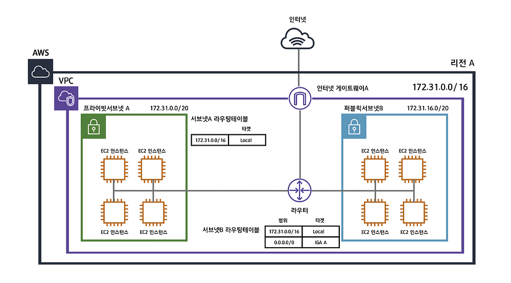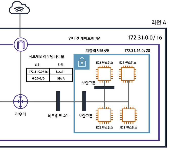 인터넷게이트웨이는 VPC와 인터넷을 연결해주는 하나의 관문입니다. 서브넷B의 라우팅테이블을 잘보면 0.0.0.0/0으로 정의되어있습니다. 이뜻은 모든 트래픽에 대하여 IGA(인터넷 게이트웨이) A로 향하라는뜻입니다. 라우팅테이블은 가장 먼저 목적지의 주소가 172.31.0.0/16에 매칭되는지를 확인한 후 매칭되지 않는다면 IGA A로 보냅니다.