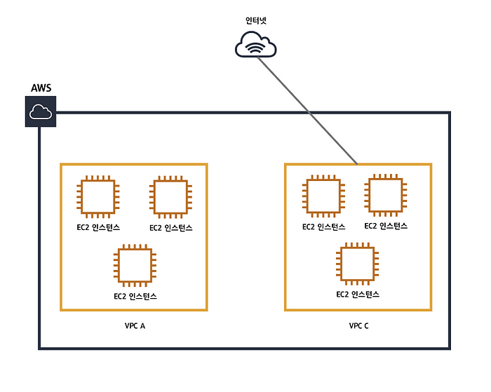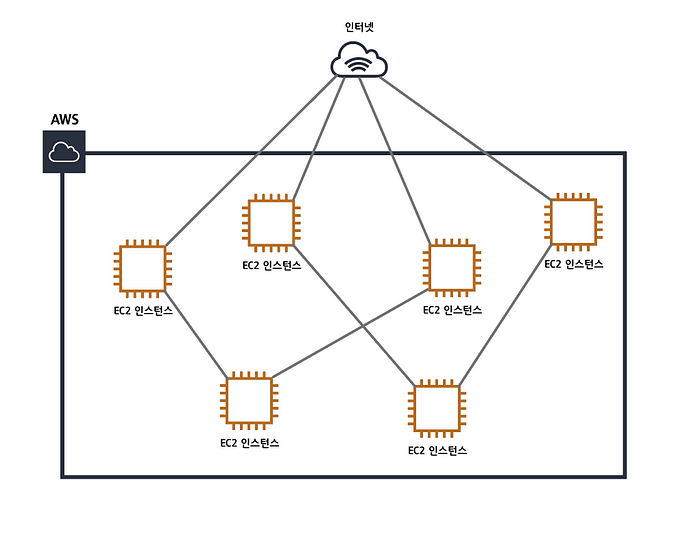 VPC가 없다면 EC2 인스턴스들이 서로 거미줄처럼 연결되고 인터넷과 연결됩니다. 이런 구조는 시스템의 복잡도를 엄청나게 끌어올릴뿐만 아니라 하나의 인스턴스만 추가되도 모든 인스턴스를 수정해야하는 불편함이 생깁니다. 마치 인터넷 전용선을 다시까는것과 같습니다.