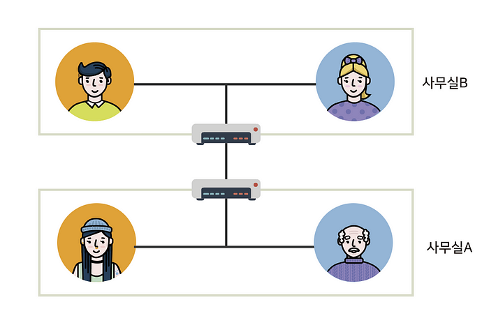VPN은 한국어로 “가상사설망"이라합니다. 앞에 “가상"이라는 단어에서 알 수 있듯 실제 사설망이 아닌 가상의 사설망입니다. 만약 위 그림과같이 회사의 네트워크가 구성되어있고 보안상의 이유로 직원간 네트워크를 분리하고싶다면 기존 인터넷선 선공사도 다시해야하고 건물의 내부선을 다 뜯어고쳐야하며 다시 전용선을 깔아주어야합니다. 이를위해 가상의 망 VPN을 사용하게됩니다.