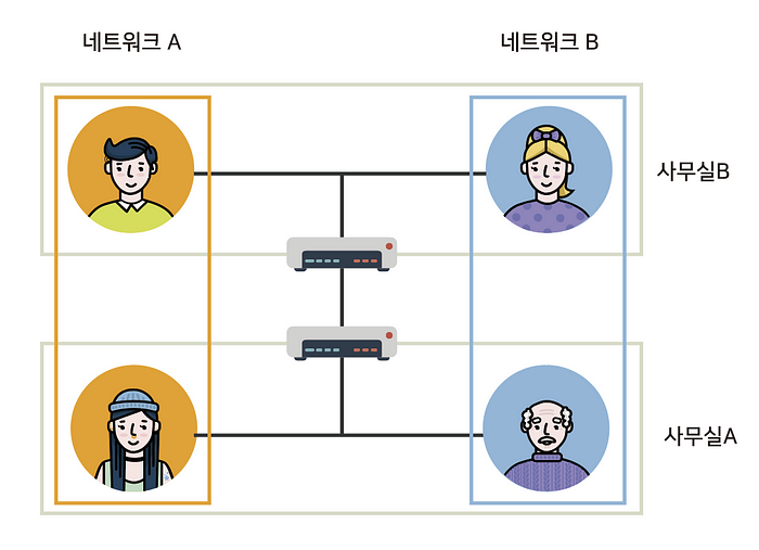VPN은 네트워크A와 네트워크B가 실제로 같은 네트워크상에 있지만 논리적으로 다른네트워크인것처럼 동작합니다. 이를 우리는 ‘가상사설망'이라고합니다.